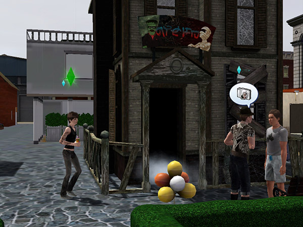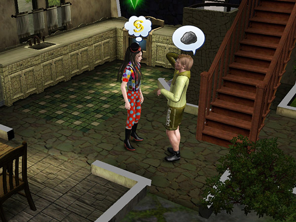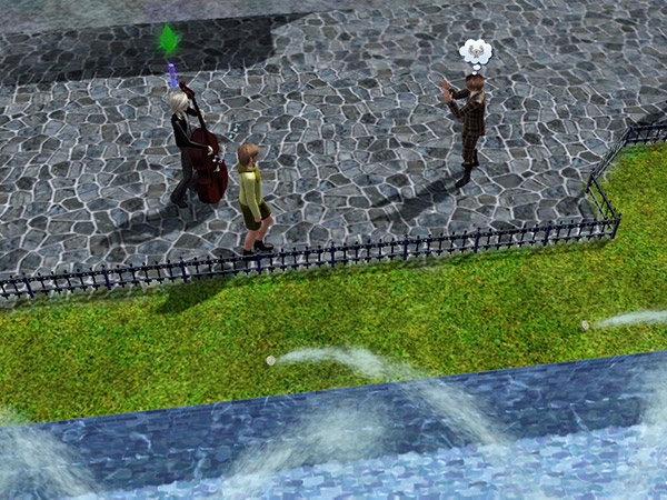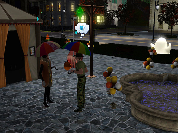イヴの願望に「バージルの写真を撮る」&「バージルの星座を知る」というのが出ていた。星座を訊ねるというのはシムの世界では恋愛活動なので、うかつに訊けないのだが、どうやらイヴはバージルが気になっているらしい。あのーあなた彼氏いますよね。まあイヴだからいいや。ということで、試しに夜のお祭り会場に呼び出してみる。着いたら雨が降ってきてしまったが。