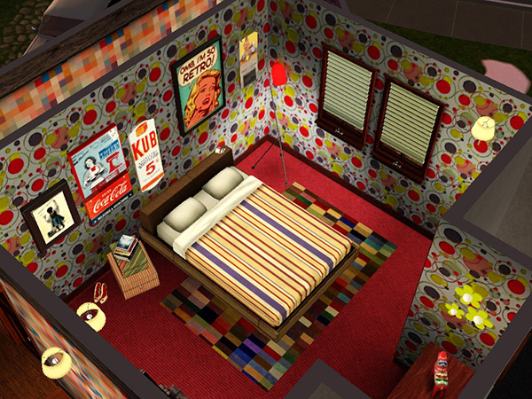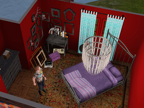 シムピープル(The Sims 1)では主役級だったイヴ・レニエとその彼氏ステファン、居候のキョウコ、ザヴィエの四人組の住まう家を今回も作り、内装を調整中。ここはイヴの部屋。イヴのインテリアの趣味は私の趣味に近いので、好きなものを好きなように並べている。カーテンはもう少しレース感のある薄い水色にしたかったのだが、少し浮き気味。