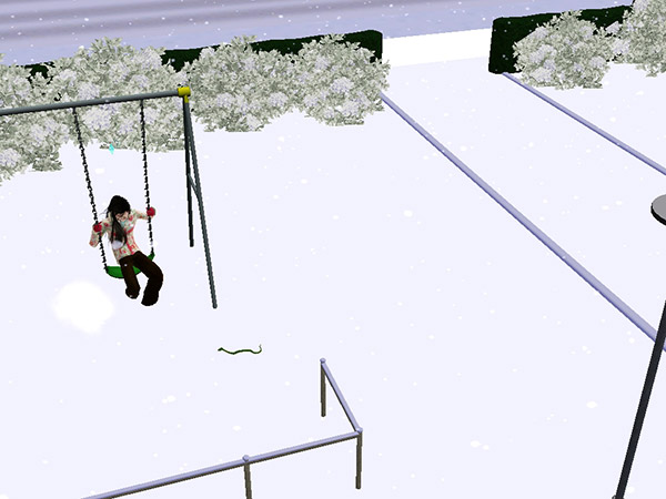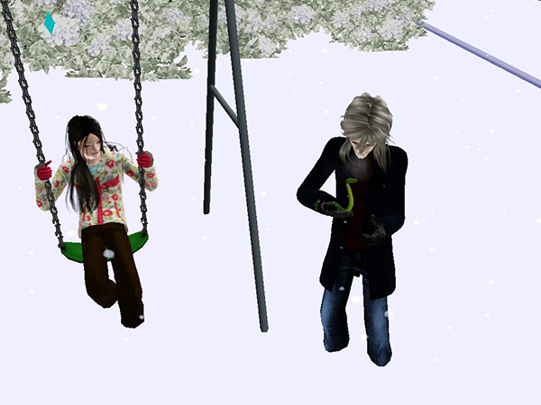 さすがに寒くなってきたのかコートを着てブランコに乗るバージル。ふと見ると、雪の上でなにやらうごめく影が……