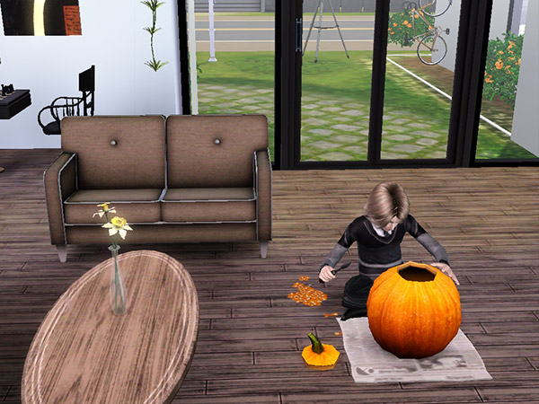 季節は秋になり、ハロウィンシーズン。セイの願望に「カボチャを彫る」というのがあったので、公園の秋祭りで収穫。