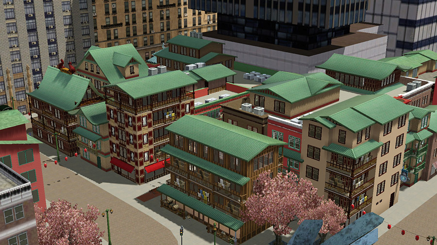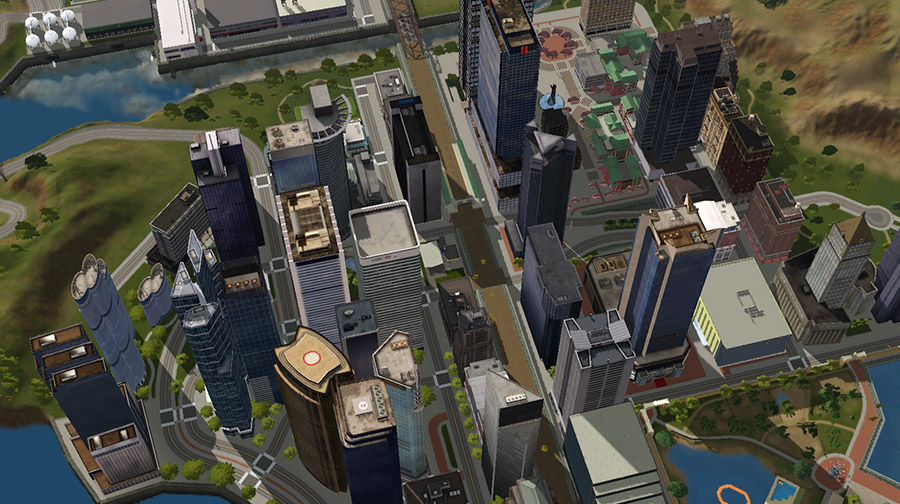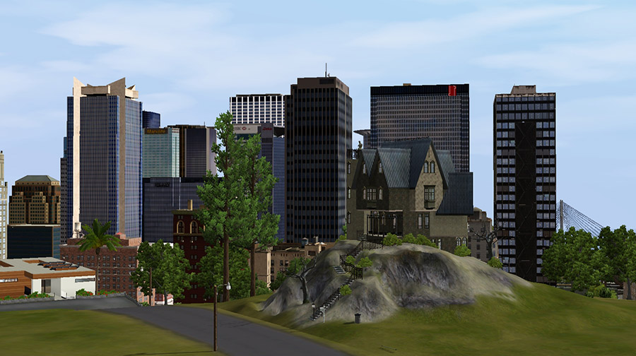 選んだのは「Fairheaven City」という、ユーザーメイドのワールド。当初は別のワールドにする予定で、そこに建てる狭め敷地のビル型アパートを拝借するためにインストールしたのだが、景観が気に入ったので、いっそこちらに住むことに。念願の都会ゾーンがあるのが魅力だが、都心のビル群は実は装飾オブジェクトであるためか、公式の「ブリッジポート」などに比べると、見た目より軽い気がする。