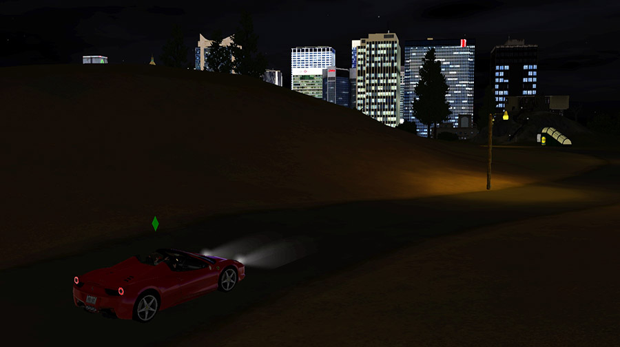 町へ下りたついでに見学しているうちに、この日は夜になってしまったので、帰宅コマンドを選んでみると、帰りは無事に車で道路を通って帰ってくれた。……電車でやってきても、なぜかマイカーをポケットから取り出せるのがシムズの世界である。