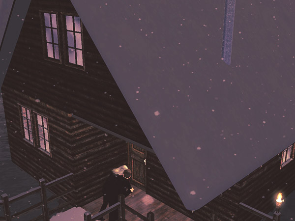 背後の花は消して木を増やし、魚発生器も消した。建築モードだと、雪景色でどう見えるかわからないのがちょっと不便。しかもデフォルト状態だとキャラが雪に埋まって不自然なので、台の高さも憶測で微調整しなければならない……。