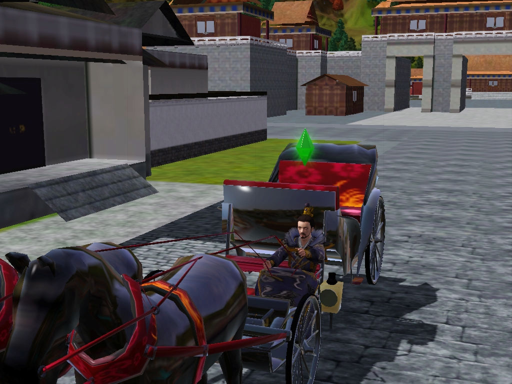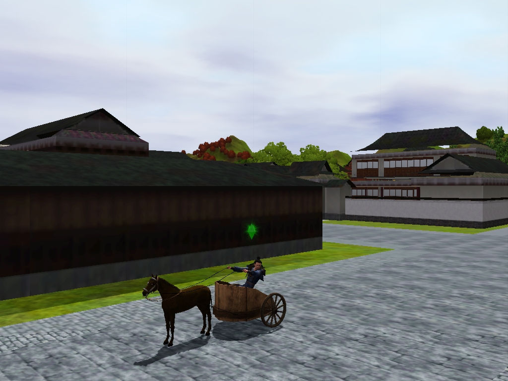 乗り物は、古代戦車(っぽいバイク)を持たせることにした。これは街とは別のクリエイターによるCCである。あくまで「っぽい」なので、音はバイクだし馬の足も動かないが、それでも町の景観がかなり改善される。