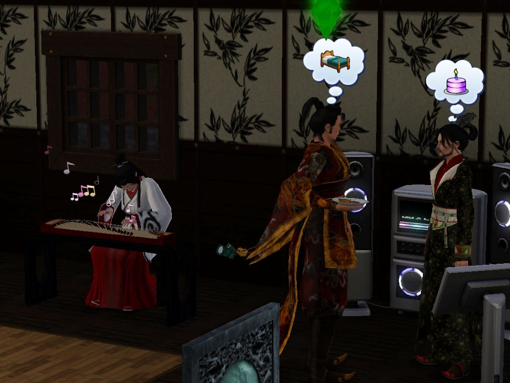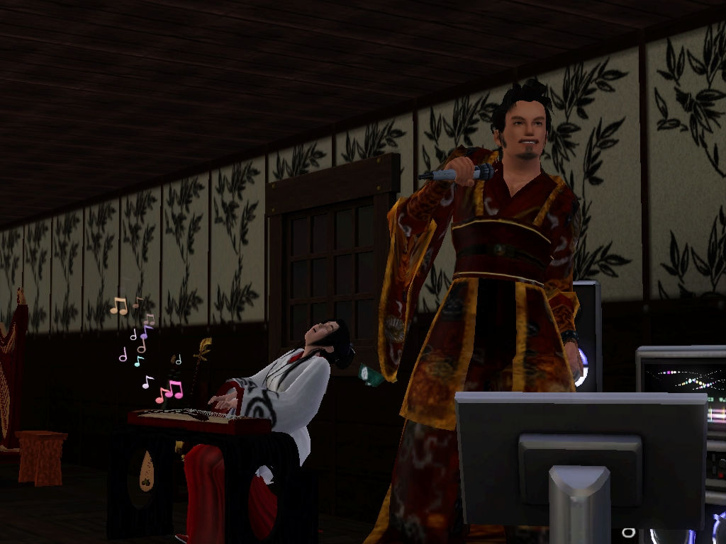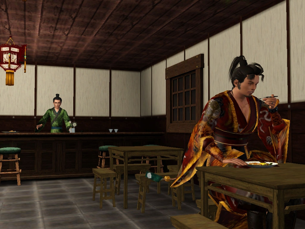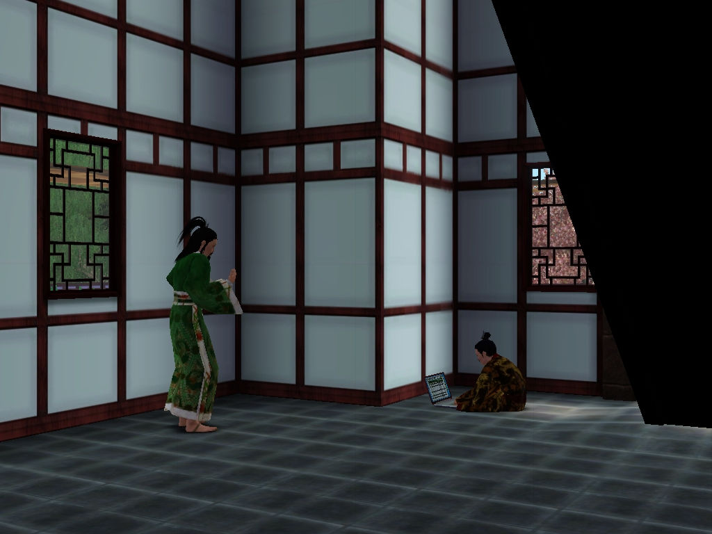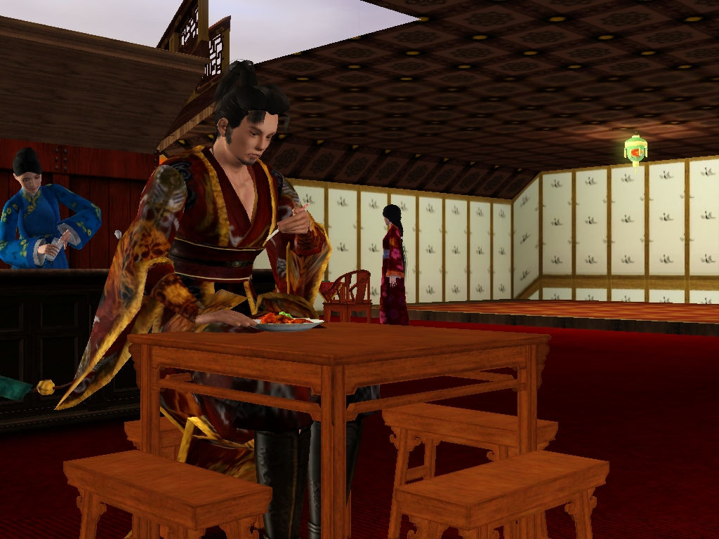隣の部屋で琴を奏でているミュージシャンNPCも、簡単に服装設定。傍らには折しも陸抗がいたので、お食事を差し入れしてみる吾彦。