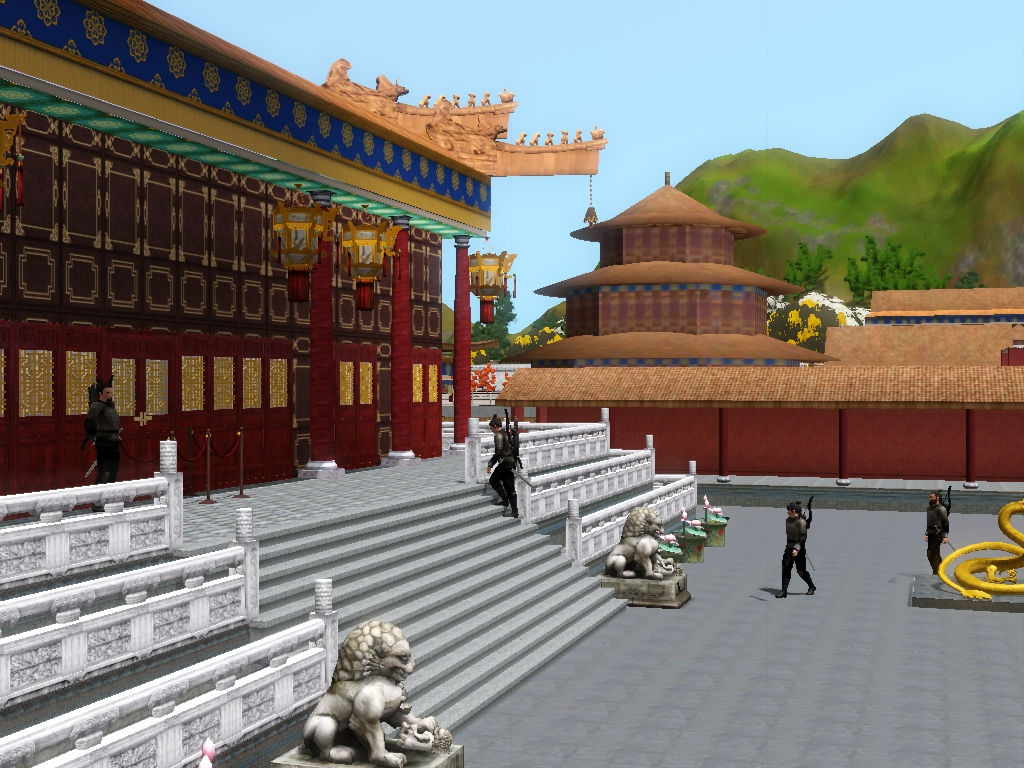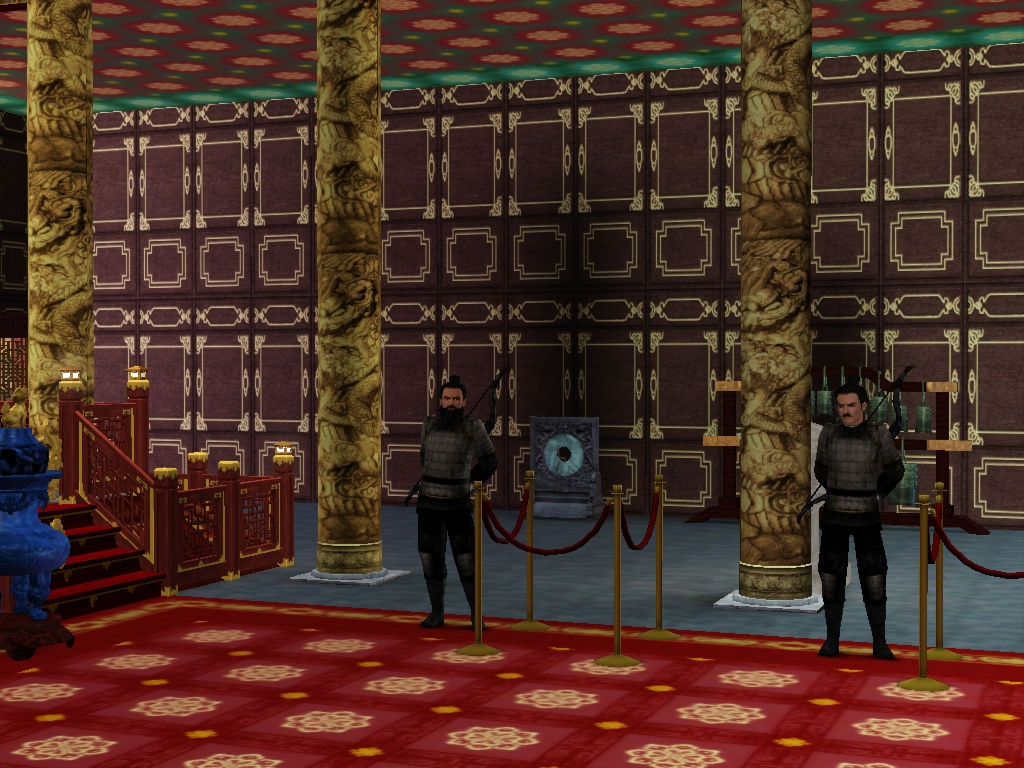 宮殿の中に配置されている「用心棒」たちの服装を衛兵っぽくしてみた。本来は、セレブ専用ゾーンなどのドア前ゲートのガードマンなのだが、チートでドアがないところに配置されているらしい。